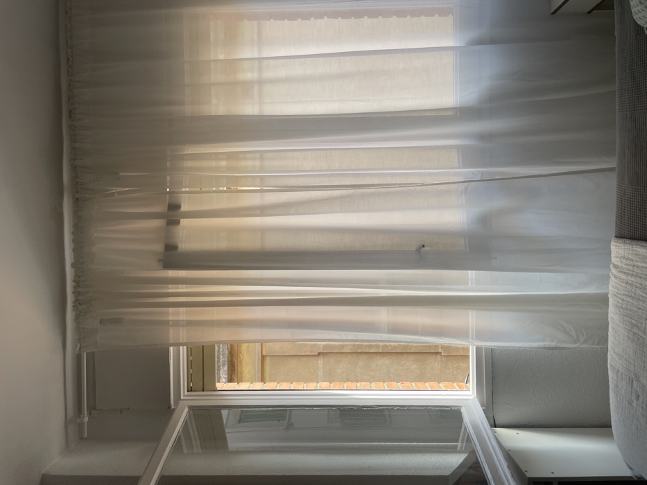 The image displays an interior view of a room in a building located in Barcelona, Spain. A window occupies most of the frame, fitted with white sheer curtains hanging from a ceiling-mounted rod. The curtains are drawn, diffusing incoming natural light, but a section of the window on the left is open. Through the open window, the exterior of an adjacent building is visible, characterized by a light-colored, possibly ochre or sandstone, facade with vertical sections of reddish-brown brickwork. Behind the sheer curtains, a roller blind is partially visible, indicating a secondary window covering. The room's interior features white or light-toned walls and ceiling. In the lower foreground, a portion of a bed or sofa is visible, covered with a white textured blanket layered over a grey checkered textile. No individuals or active subjects are present in the scene.