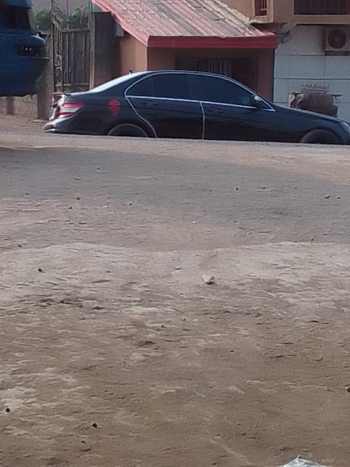 The scene is set in an unpaved area of Nkwelle Ezunaka, Nigeria, under daylight conditions. The foreground consists of light brown, uneven dirt or sandy ground, scattered with small rocks and debris. In the midground, a black Mercedes-Benz C-Class sedan (W204 model) is parked, appearing partially sunken or resting in a depression, with its wheels mostly obscured by the surrounding earth. The vehicle features tinted windows, a rear spoiler, and a red skull-like emblem affixed to its driver's side rear quarter panel. Light-colored lines are discernible along the car's door seams. To the far left in the background, a section of a dark blue vehicle, possibly a truck or bus, is partially visible behind a dark gate. In the background on the right, a building with an orange-red tiled roof and light brown walls is present. An air conditioning unit is mounted on an adjacent, lighter-colored section of the building. No individuals or specific actions are observed within the frame.