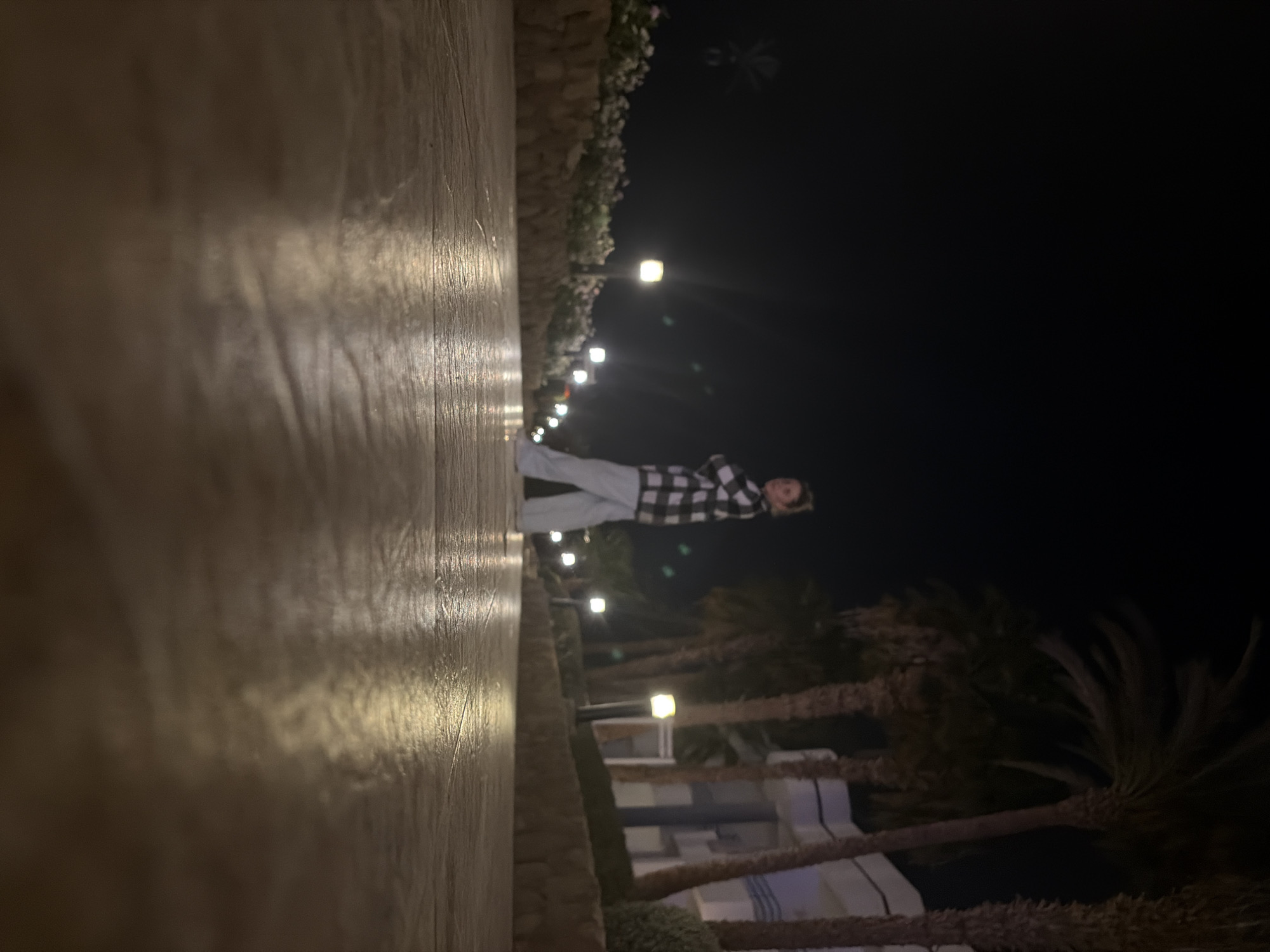 A person stands on a brightly lit walkway beside a row of lights and trees in Sharm El Sheikh, Egypt, at night. The person is wearing light pants and a dark and white plaid shirt. Their arms are raised near their head, as if posing. The walkway, which is a light tan, runs to the horizon. Palm trees and buildings are visible behind the person. The sky is dark.