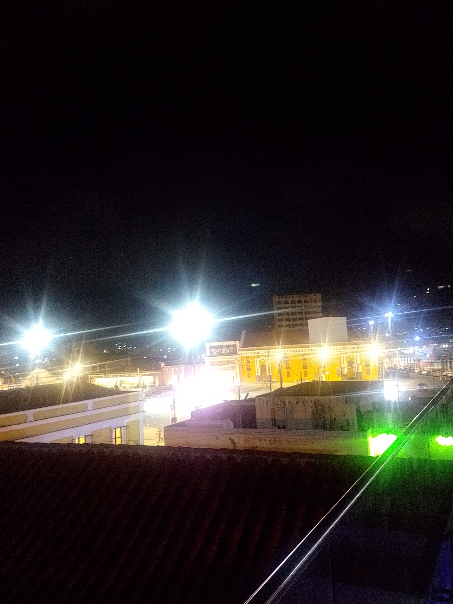nighttime view of Puerto Cabello, Venezuela. A large, brightly lit yellow building with white trim dominates the middle ground, with a tall white structure behind it, and a multistory building behind that. A tiled roof is in the foreground. Bright streetlights illuminate the scene, causing glare. There is a fence-like object in the bottom right corner. There is a building with bright green lights on the right. The sky is dark.