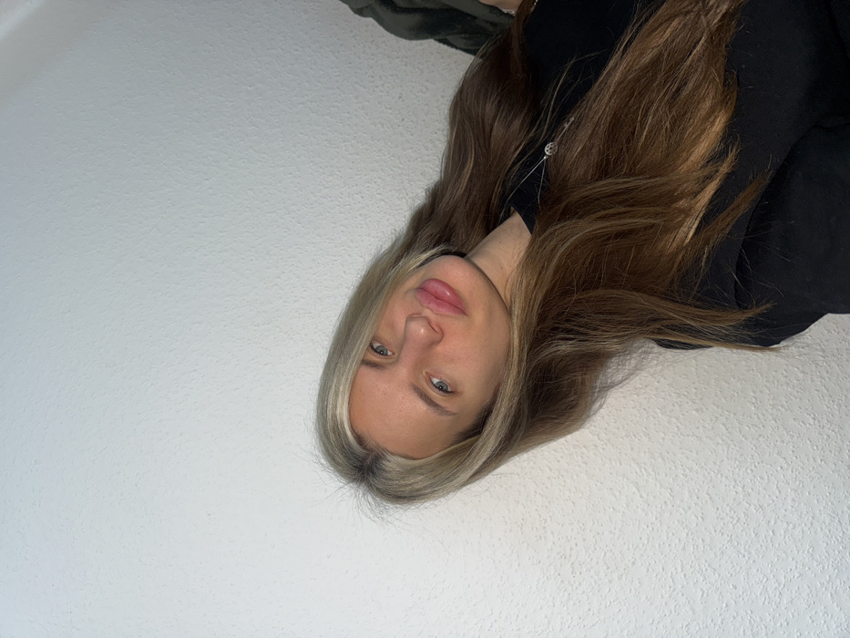 A single female subject is depicted in a medium close-up, angled shot. She has long, wavy hair, with prominent blonde highlights at the crown transitioning to light brown and darker brown along the length. Her head is tilted slightly to the right, and her gaze is directed towards the camera. Her facial features include full lips, light-colored eyes, and visible pores on her skin, suggesting minimal makeup. She is wearing a dark, possibly black, long-sleeved garment and a delicate silver-toned necklace with a circular pendant featuring a key or lock-like design. The background consists of a plain, light-colored, textured wall, likely painted white or off-white, with visible stucco or plaster finish. No other objects or individuals are visible. The specific location in the city of Berlin, Germany, cannot be determined from the visual information provided in the image.