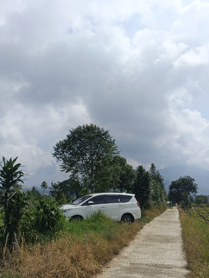 The scene depicts an outdoor environment in Nam Sa Lat, Myanmar, under a sky with significant cloud cover and intermittent blue patches. A white multi-purpose vehicle is parked partially off the left side of a narrow, light-colored concrete road, angled away from the camera. The front of the vehicle is partially obscured by dense green and dry brown vegetation. The concrete road extends into the background, flanked by overgrown grass and scattered trees. A cultivated field with organized rows of green plants is visible on the far right. In the distance, several large green trees are positioned against a backdrop of hazy, blue-grey mountains. No individuals or animals are present.