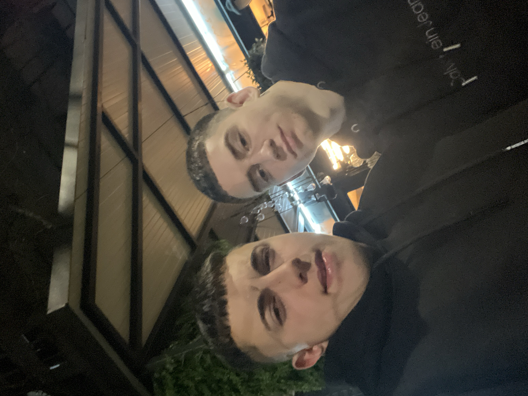 Two men are posing for a selfie outdoors at night