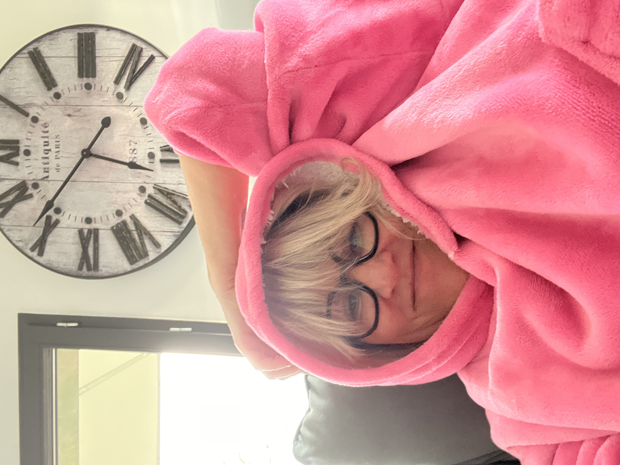person wearing a pink hooded garment. The person has short blonde hair and is wearing glasses. A clock is visible on the wall, displaying Roman numerals and the phrase "Antiquite de Paris" and "387" at the two o'clock mark. Below the clock, a grey window frame is visible. The image does not contain enough information to identify the city as Chambœuf, France. There is no clear evidence of actions or interactions.