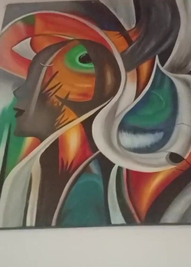 painting hanging on a white wall. The painting features an abstract depiction of two faces, one dark and one light, intertwined with other abstract shapes in various colors including orange, green, and gray. The camera zooms in slightly on the painting.