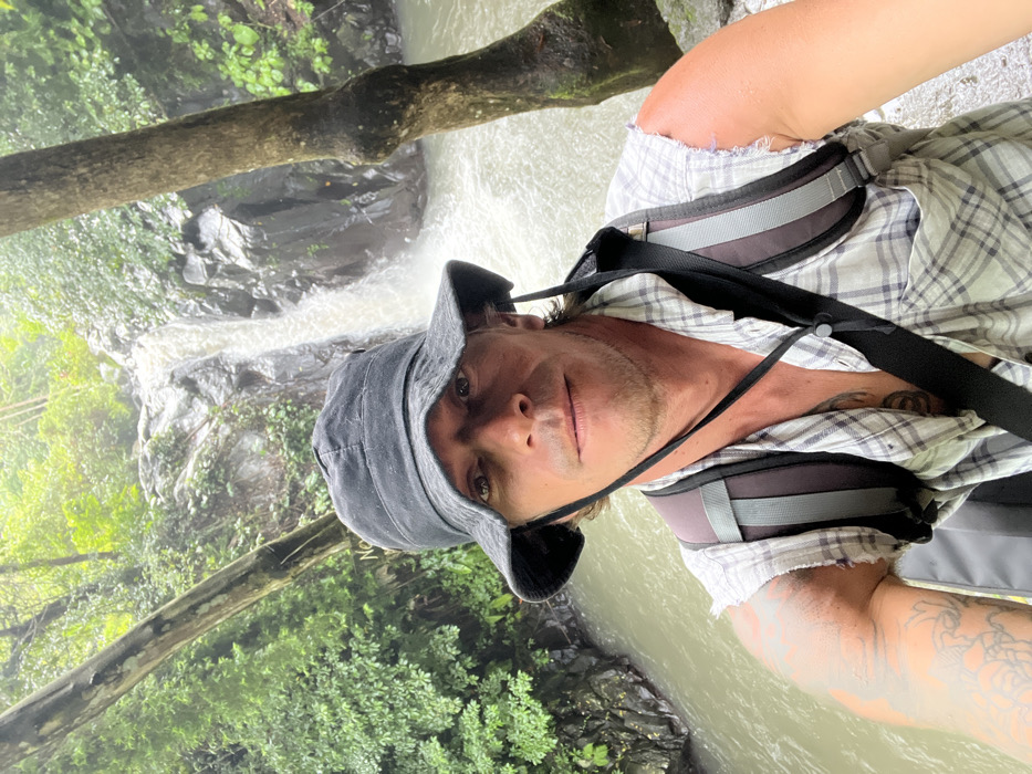 - "A man in a bucket hat, plaid shirt, and backpack poses, a flowing waterfall serving as the backdrop" by FM-ge8sE3, licensed under CC BY 4.0