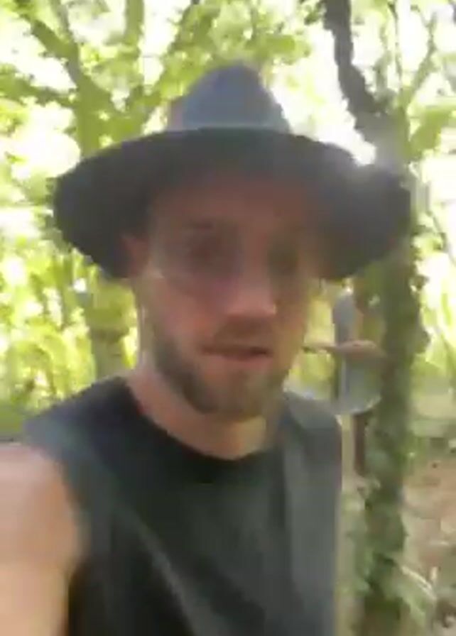 A man is taking a selfie video while walking through a wooded area. He is wearing a black hat, sunglasses, and a black sleeveless shirt. Another person is walking behind him. The environment is bright and sunny, with lots of green foliage.