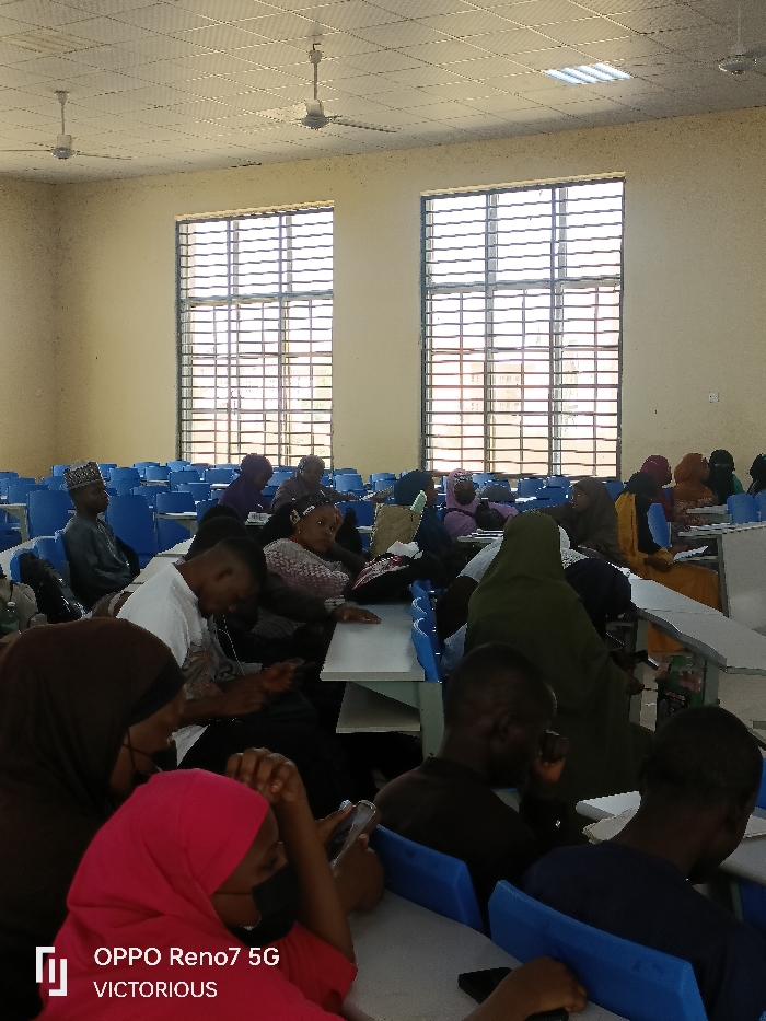 This image displays the interior of a large lecture hall or classroom situated in Dutse, Nigeria