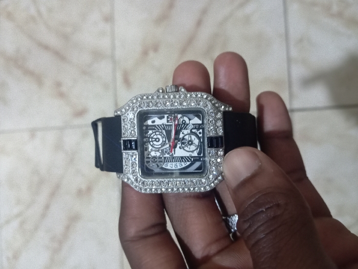 An individual with dark brown skin holds a wristwatch in their left hand, positioned against a light beige tiled surface with faint, irregular patterns, consistent with a location in Afaka, Nigeria. The wristwatch features a rectangular, silver-toned case with rounded corners, encrusted with numerous small, clear, circular gemstones around the bezel. A prominent crown is visible on the right side of the case. The watch dial is skeletal, revealing internal mechanisms and gears, with a black and white design. Red hour and minute hands are visible, along with a small sub-dial with a red hand near the 6 o'clock position. The watch is fitted with a black strap, likely rubber or silicone, connected to the case by two black rectangular segments. The individual's thumb, index finger, and middle finger are visible, with a silver-toned ring on the ring finger.