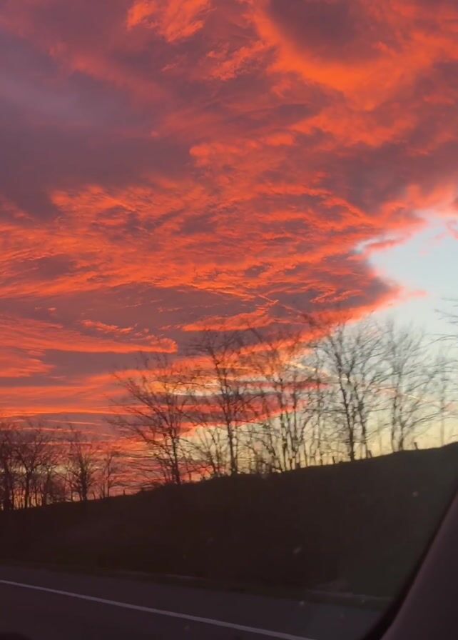 vibrant sunset from the perspective of someone driving down a highway. The sky is filled with bright orange and red clouds, contrasting with the darkening landscape. A line of bare trees sits atop a hill alongside the road. A white contrail cuts through the sky. The camera is positioned inside a car, with parts of the dashboard visible. The road stretches out in front, featuring white lane markings.