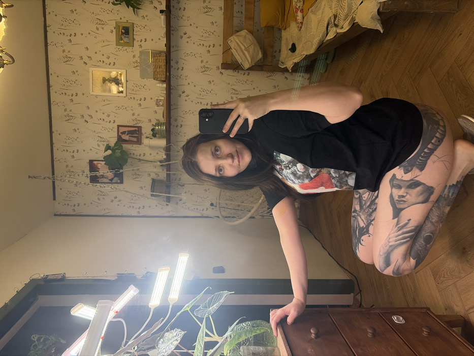 A woman with tattooed legs kneels, holding a phone, capturing her reflection in a mirror. She's wearing a black t-shirt. Behind her, the mirror reflects a room with patterned wallpaper, shelves adorned with photos, and a bed with pillows. In the foreground, a cabinet supports plants illuminated by grow lights. The image composition is a mirror selfie capturing the woman and her environment.