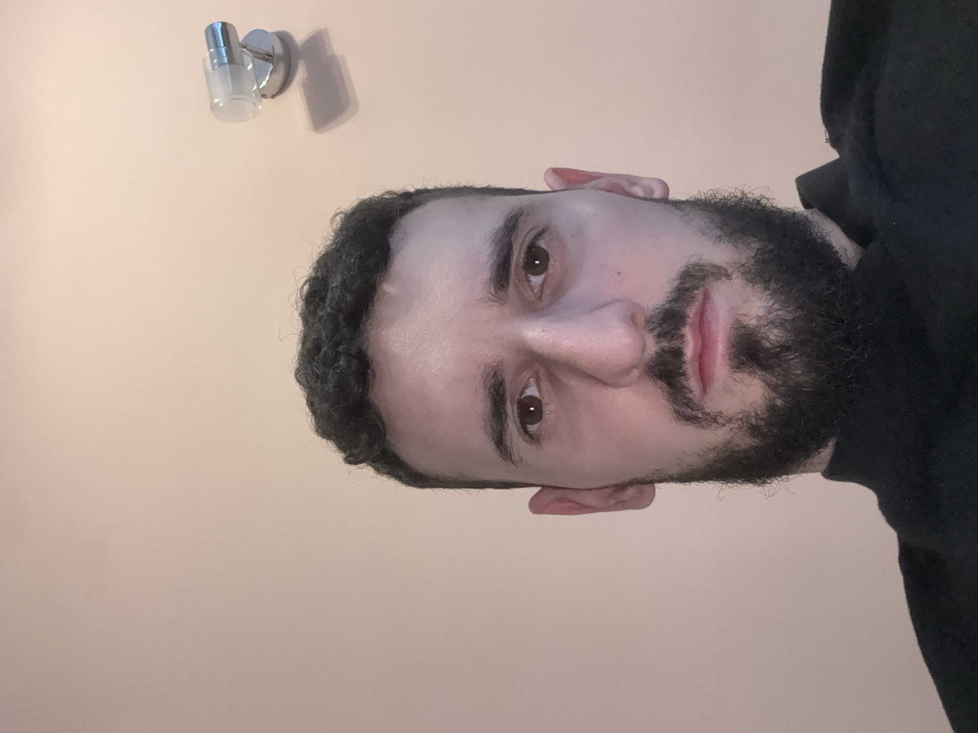 A man with dark hair and a full beard is facing the camera
