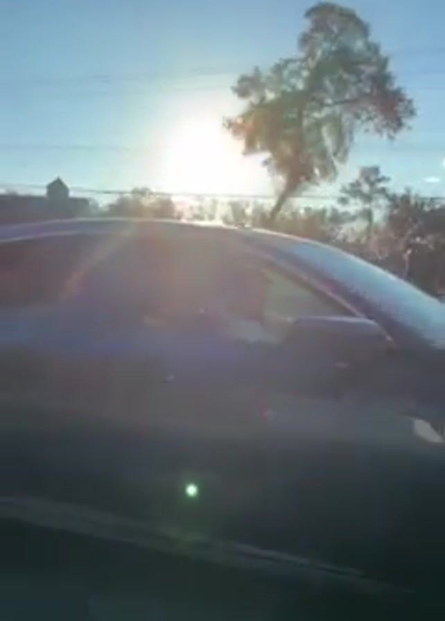 A blue car drives past the camera, with the sun shining in the background. A man wearing a hat is visible in the driver's seat.