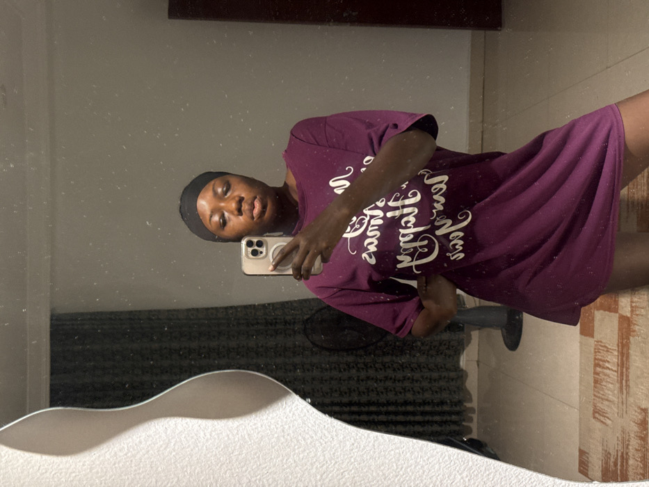 A person in a purple t-shirt with white script and a black cap is taking a selfie