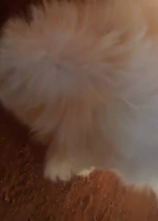 small, fluffy, white dog on a sandy, reddish-brown ground. The dog looks up at the camera briefly, then the camera angle shifts and the dog is seen from above again, facing away. The ground is illuminated by sunlight.
