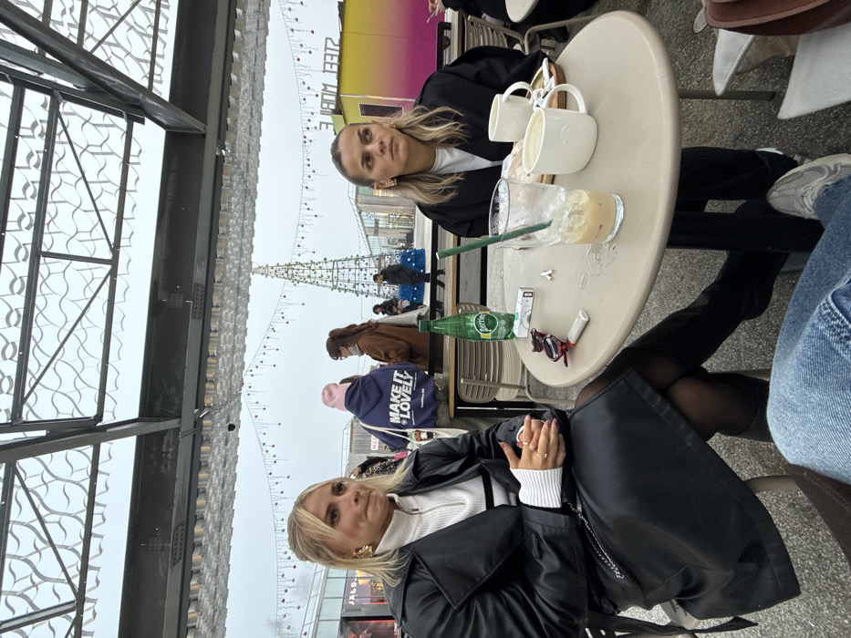The scene depicts an outdoor café area within the Steel Saint-Étienne shopping center, located in Saint-Jean-Bonnefonds, France, under an overcast sky. A patterned metallic canopy covers the seating area. In the foreground, two women are seated at a round, light-colored table. The woman on the left has blonde hair, partly pulled back, and is wearing a white half-zip turtleneck sweater under a black faux leather trench coat. She is also wearing black opaque tights and black knee-high boots. Her hands are clasped in front of her, and she has gold hoop earrings and rings on her fingers. A black chain-strap bag is visible on her left. The woman on the right has blonde hair, pulled back, and wears a black blazer over a light-colored top. She is looking towards the right side of the frame. Her right arm is resting on the table next to a white mug. On the table, there is a partially consumed iced coffee in a clear glass with a green straw, two white ceramic mugs (one identifiable as Starbucks), a green Perrier sparkling water bottle, a white cigarette pack (Marlboro Ice Blast), a red plastic lighter, dark sunglasses with red frames, and a small metallic object. A small spill is visible near the iced coffee glass. The perspective is from a third person seated at the same table, with a partial view of their blue-jeaned lap and a light-colored sneaker in the lower left corner. In the background, an open-air plaza features a large, conical Christmas tree structure adorned with lights and ornaments. String lights with small red and green baubles are strung above the plaza. Commercial buildings are visible, including one with "STEEL MOBILE" signage and another partially showing "JALS" or "JAL'S". Several individuals are walking in the background, including one wearing a pink beanie and a blue hoodie with "MAKE IT LOVELY" text, and another in a brown coat. The ground is paved.