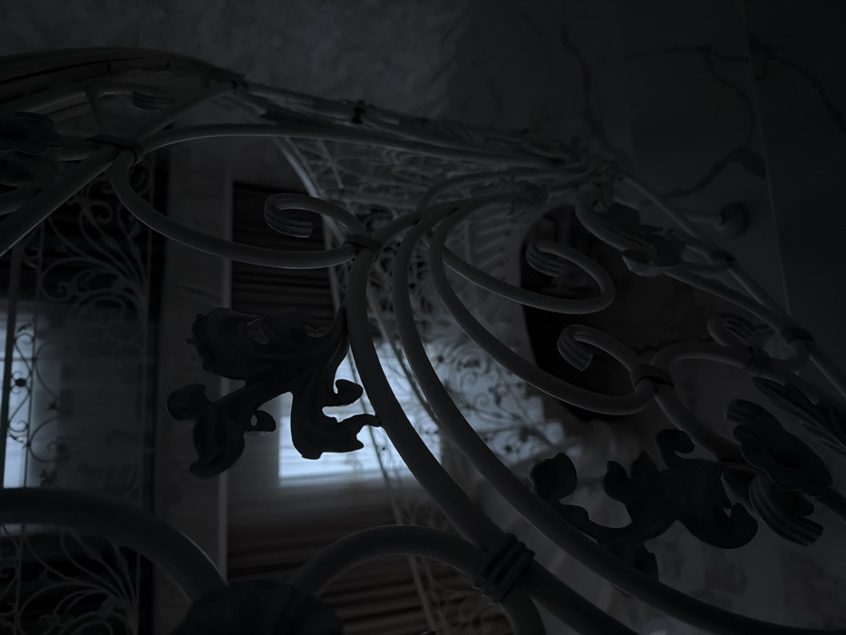 The image presents an interior scene within a building in Ershov, Russia, primarily focused on an ornate white metal railing. This railing, likely part of a staircase or balcony, dominates the foreground and midground, exhibiting intricate scrollwork and decorative elements such as stylized leaves. The environment is dimly lit, with a distinct rectangular light source, consistent with a window, visible in the background, casting a bright silhouette onto portions of the foreground metalwork. Beyond the primary railing, additional sections of similar white, ornate metal structures are visible, alongside dark-toned drapes and what appears to be a patterned wall. No individuals are present within the frame, and no specific actions or interactions are occurring. The overall aesthetic is characterized by cool, desaturated tones.