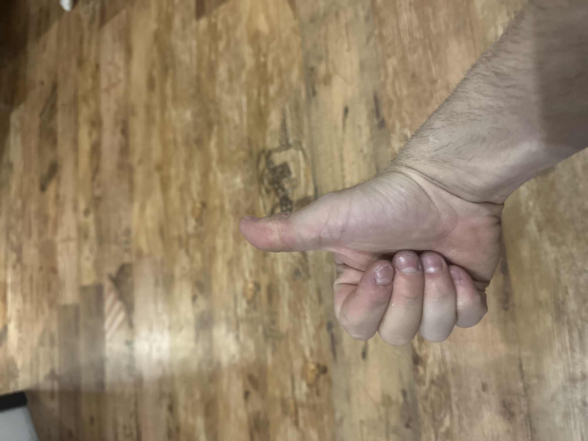 A close-up, angled shot depicts the right forearm and hand of an individual, extending into the lower-center of the frame