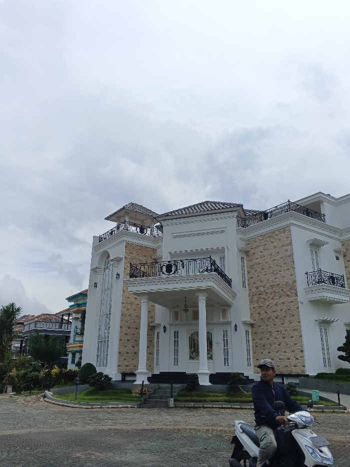 The image depicts a residential street scene in the city of Unknown, Vietnam, under an overcast sky. In the midground, a large, multi-story, white and light-beige stone house with classical architectural elements is prominently featured. It possesses multiple balconies with black wrought iron railings, a central entrance portico supported by four white columns, and dark tiled roofing. The house is surrounded by manicured green lawns and trimmed bushes. To the left, several other large residential buildings with varying architectural styles are partially visible in the background. In the foreground, an adult male, wearing a dark jacket, light pants, and a baseball cap, sits stationary on a white and dark-colored automatic scooter, facing left. The ground beneath the scooter and extending into the foreground is paved with interlocking pavers or cobblestones. A green waste bin is partially visible on the right side of the primary house's lawn.