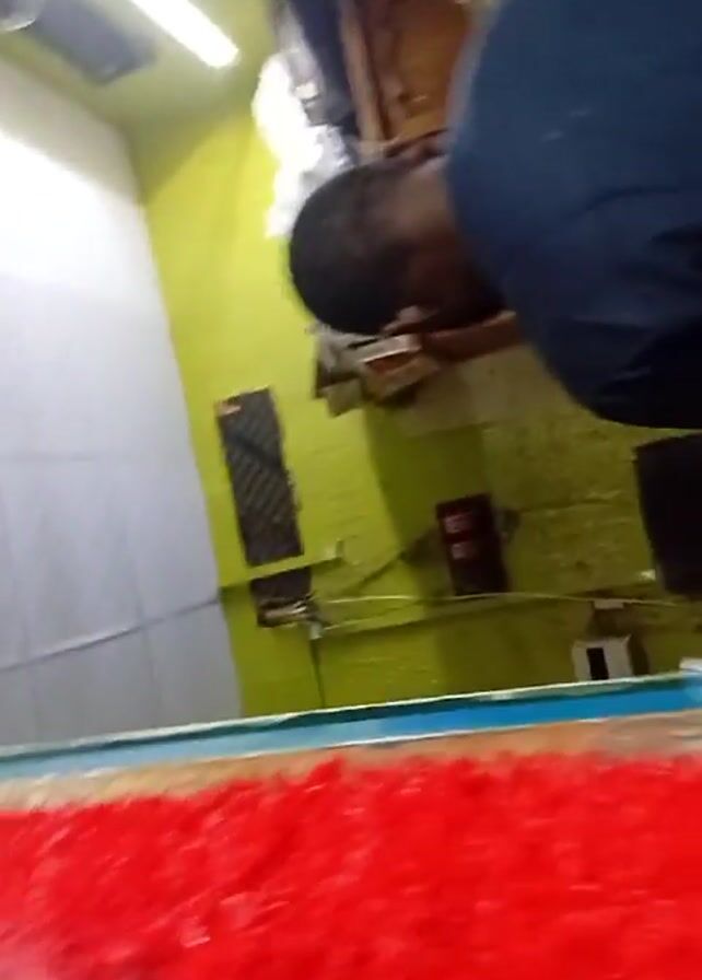 The video begins with a close-up of a bright red, bristled surface. The camera shifts to show a Black man in a dark blue jacket bending over, looking at something behind the red surface. The room has light green walls, with a mix of items on a shelf behind him, including boxes and bags. A small oscillating fan is visible on the ceiling. The man continues to look down, and the camera angle changes slightly, providing a broader view of the cluttered environment.