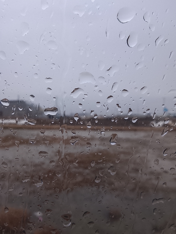 A rain-covered window obscures a gray, blurred landscape