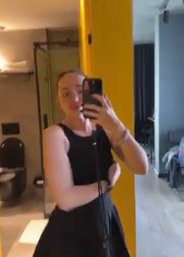 A woman in a black tank top and black pleated skirt stands in front of a mirror and records a video of herself