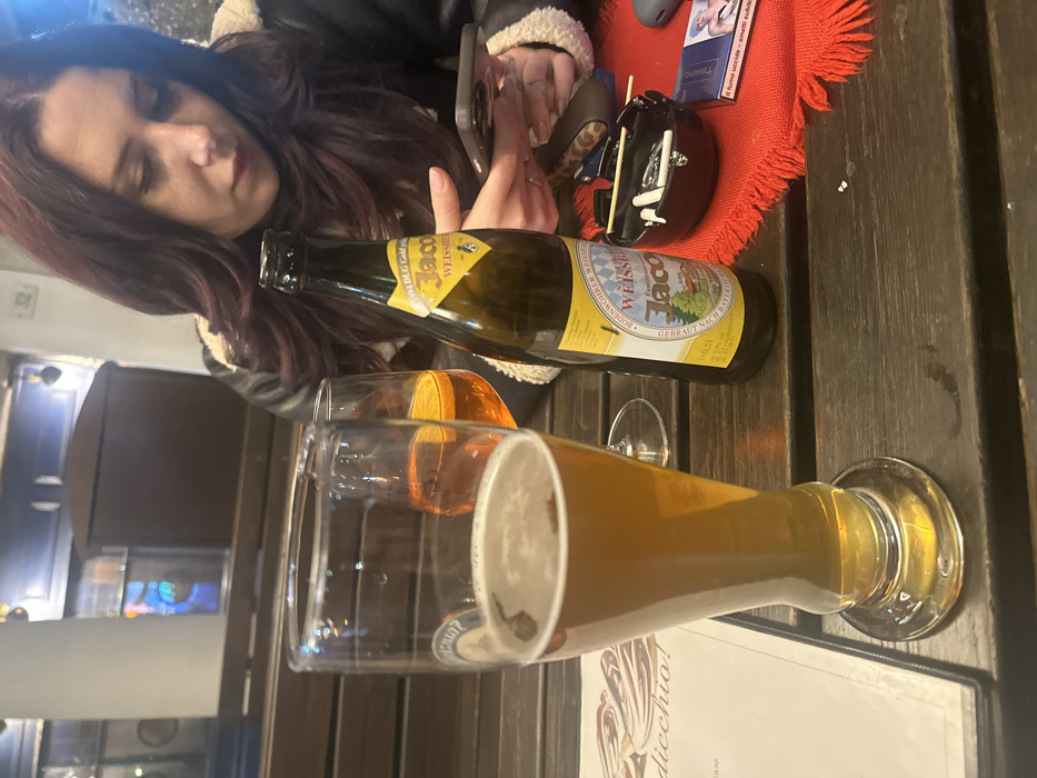 The image captures an outdoor or semi-outdoor table scene during the evening or night, identified as Treviso, Italy, due to a visible menu item "radicchio!". A dark-stained wooden slatted table is the primary surface. On the left, a tall glass containing approximately two-thirds full of light-colored beer with a thin foam head rests on a clear coaster. Behind it, a stemmed glass holds an orange-hued beverage, garnished with an orange slice. An open 0.5-liter brown glass bottle of "Familienbrauerei Jacob Weissbier" stands upright near the center. To the right, a black ceramic ashtray contains several white cigarette butts and two partially smoked cigarettes, along with a white matchstick. Adjacent to the ashtray, a blue and white cigarette pack (Chesterfield, with Italian health warnings) lies on a red fringed placemat. A female individual is seated on the right, her long dark reddish-brown hair partially obscuring her face as she focuses intently on a dark smartphone held in both hands. She wears a dark jacket with cream-colored fleece lining. A ring is visible on her left ring finger. The background is blurred, showing architectural details, artificial lighting, and a faint number "32" on a light-colored column.