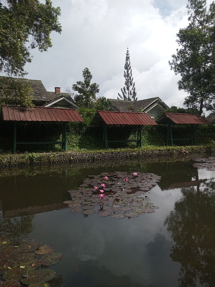 A still pond reflects a cloudy sky and surrounding structures. Lily pads with pink blossoms dot the pond's surface. Red-roofed shelters line the pond's edge, backed by greenery. Houses with sloping roofs are partially visible behind the shelters. Tall trees frame the scene, enhancing the serene and somewhat overcast atmosphere.