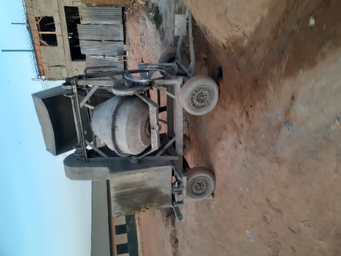 A concrete mixer is positioned outdoors, next to a construction site. The mixer appears to be portable, with two wheels visible. To the left, there's an unfinished building made of blocks, featuring exposed rebar and open window spaces. Corrugated metal sheets are stacked nearby. The ground is dirt, suggesting an active construction zone. The mixer itself seems sturdy and ready for operation.
