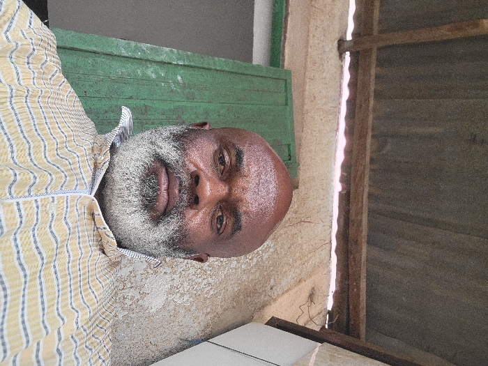 The image depicts an adult male positioned centrally, looking directly at the camera. He has a bald head and a full, dense, well-maintained grey beard and mustache. His skin is dark-toned, and his face exhibits some sheen, possibly from perspiration. He is wearing a collared shirt featuring a pattern of alternating thin white stripes and wider yellow bands containing faint dark blue horizontal lines. The shirt collar is white with subtle dark pinstripes, and a white placket with a zipper closure is visible at the front. The background suggests an outdoor or semi-sheltered area in Maiburiji, Nigeria. To the left of the individual is a weathered green wooden door or shutter, showing signs of paint wear and deterioration. The wall directly behind and to the right of the individual is a textured, light beige or off-white color, appearing aged with possible plaster or stucco finish. Above, a rudimentary roof structure is visible, composed of corrugated metal sheeting supported by rough-hewn wooden beams. A gap between the wall and the roofline allows ambient light into the scene.