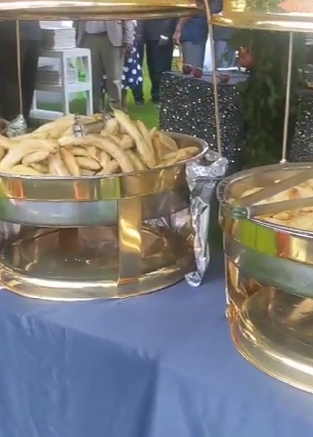 buffet line at an outdoor event. There are several golden chafing dishes filled with food, including fried meat and plantains. The chafing dishes are arranged on a table covered with a blue tablecloth. People are seen in the background, some of them wearing formal attire. The environment is a green lawn, possibly a garden, with a tent overhead. The atmosphere seems festive, with music playing in the background. Staff members wearing uniform vests are present, tending to the buffet.