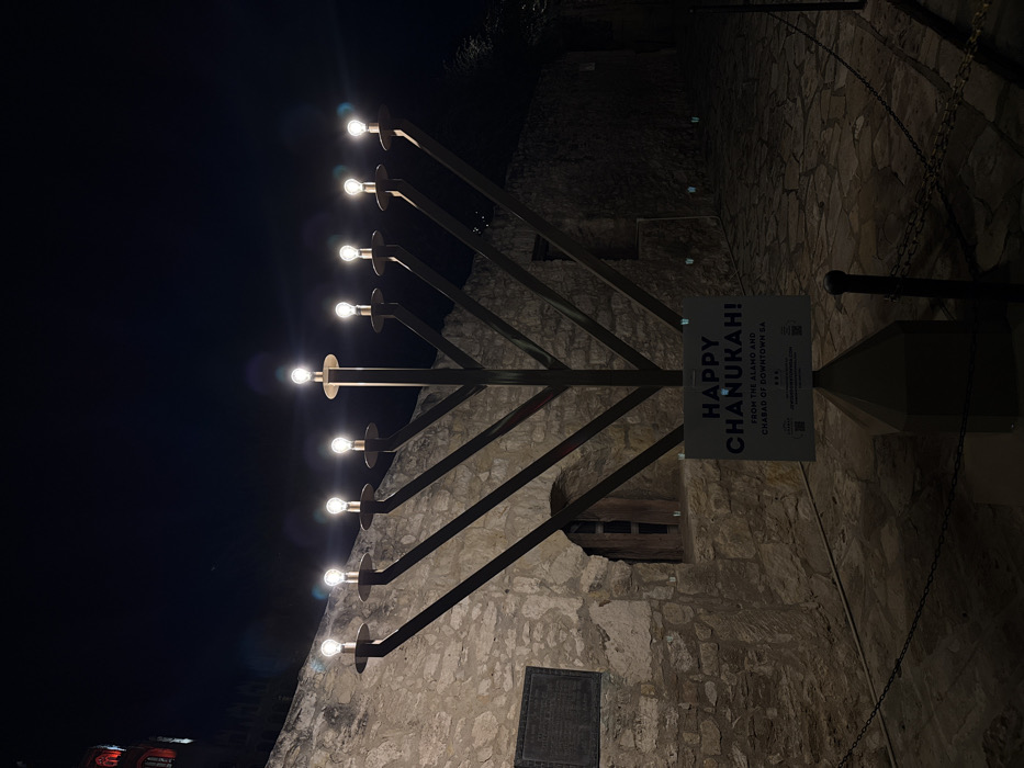 - "A sideways shot shows a large menorah with nine lit bulbs in front of a stone structure at night" by FM-avfjN2, licensed under CC BY 4.0