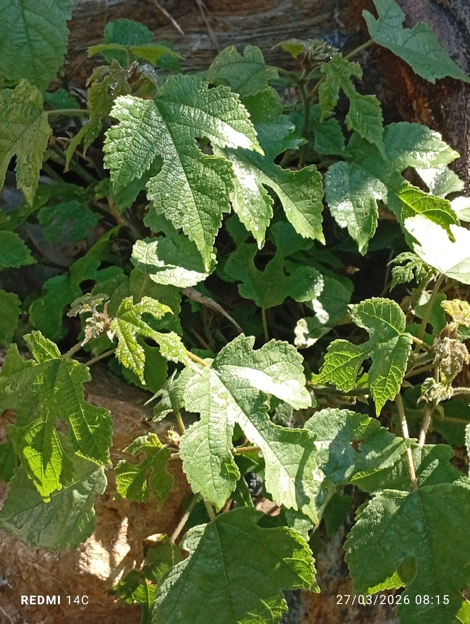 The image displays a close-up, high-angle view of green foliage, presumably taken in Grhala, Pakistan. Numerous leaves of a climbing or sprawling plant are visible, characterized by varied shapes including deeply lobed, palmate-like structures and more ovate forms with serrated edges. Many leaves exhibit small, spherical water droplets on their surfaces, consistent with dew or recent precipitation. The foliage is predominantly green, with visible venation patterns. Direct sunlight illuminates sections of the leaves, creating bright highlights and distinct shadows. A textured, irregular brown surface, consistent with tree bark or an old stone wall, serves as the background. No individuals, animals, or specific actions are depicted. The image includes a "REDMI 14C" watermark in the lower-left corner and a timestamp "27/03/2026 08:15" in the lower-right corner.