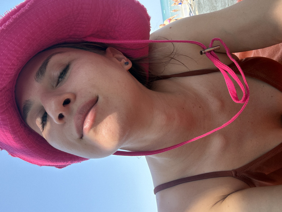 A woman, seen from a low angle, wears a pink hat with a matching chin strap. She appears to be at the beach with people and the sea visible in the background. The woman is wearing a brown swimsuit. The woman's face is softly lit with closed eyes, and the sky provides a bright backdrop.