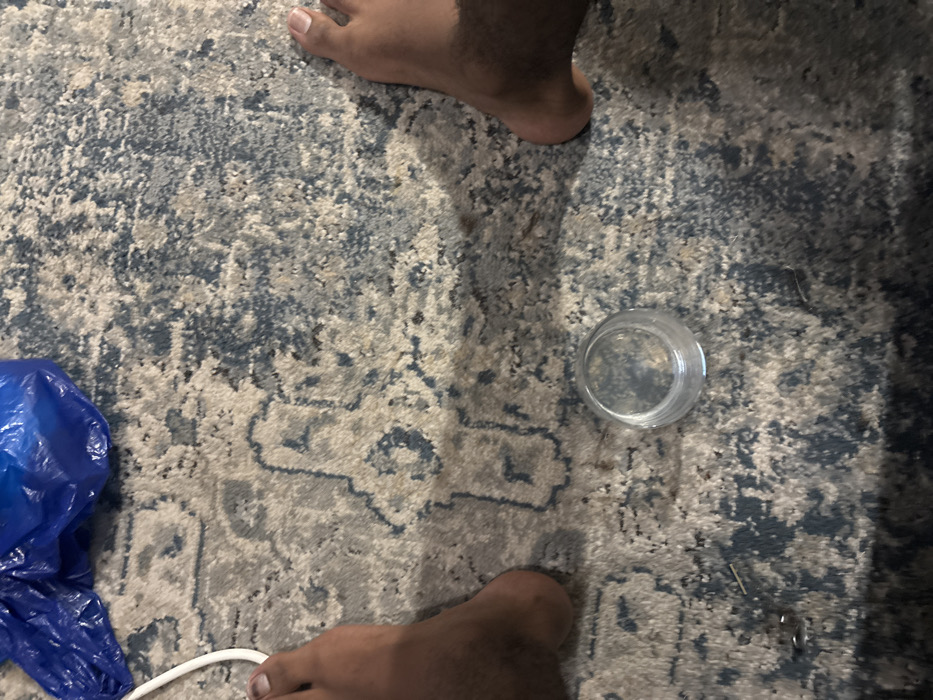 The image displays an overhead view of an indoor floor area. The floor is covered by a low-pile carpet featuring an abstract, distressed pattern in shades of grey, beige, and blue. Small, dark fibers and debris are visible across the carpet surface. In the lower-center portion of the frame, a small, empty, transparent glass or clear plastic container rests upright. In the upper-left quadrant, a crumpled blue plastic bag or sheet is partially visible, with a white cord extending from underneath it along the left edge of the frame. Two bare human feet, exhibiting a medium-to-dark skin tone, are positioned at the bottom-left and bottom-right edges of the frame. The left foot's toes are partially obscured by the white cord. No explicit actions or interactions are depicted; all subjects and objects are stationary.