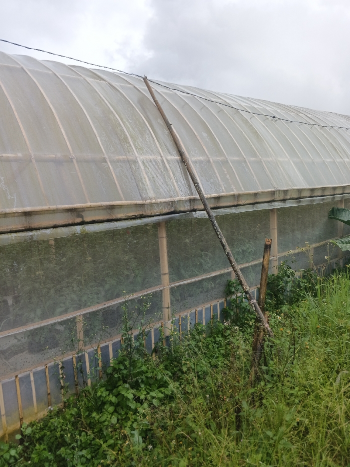 The image displays an exterior view of a tunnel-style greenhouse situated in the city of Unknown, Nepal, beneath an overcast sky. The greenhouse is constructed with a translucent plastic covering over a framework of light-colored, likely bamboo, arches and vertical supports. Visible within the structure are cultivated green plants. Moisture is present on the plastic sheeting. A dark horizontal band delineates the lower wall section of the greenhouse. The foreground and mid-ground are characterized by dense, wild green vegetation, including grasses and broad-leafed plants, growing up to the base of the greenhouse. A long, weathered wooden pole, consistent with bamboo, leans against the greenhouse roof, originating from the lower right and ascending towards the upper left. This pole supports a thin, dark wire running horizontally above the greenhouse. The leaning pole is attached by a dark cord to a shorter, upright wooden stump with a jagged top, positioned in the mid-ground. No individuals are depicted.
