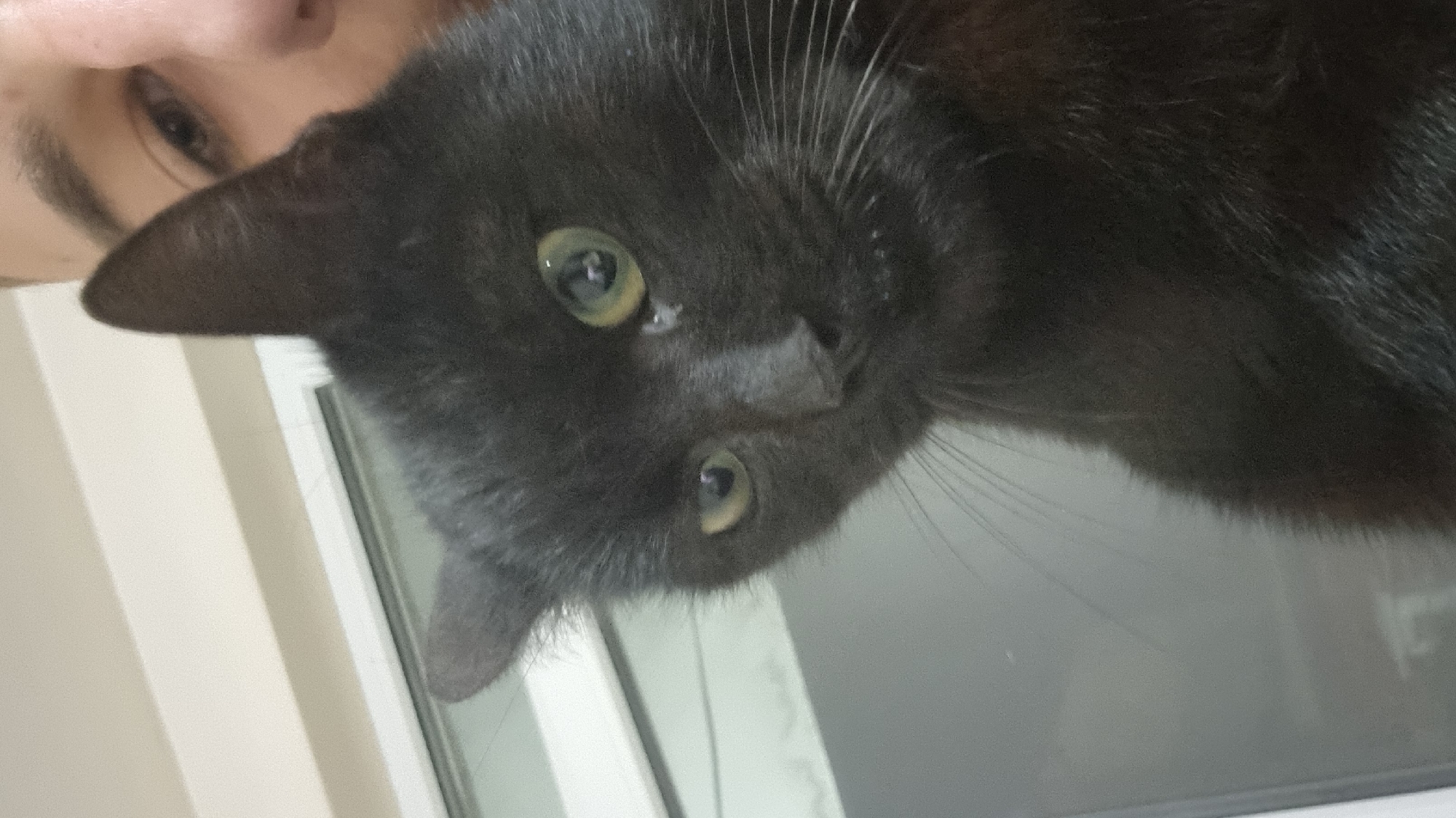 The image captures a close-up indoor scene in Pchelnik, Bulgaria, featuring a black cat and a partial human face. The black-furred cat, which is the primary subject, occupies the majority of the foreground. Its greenish-yellow eyes are directed slightly left of the viewer, and a visible tear or discharge is present at the inner corner of its left eye. White whiskers extend from its muzzle. In the upper right portion of the frame, the right eye, eyebrow, and bridge of the nose of a human with fair skin are visible, indicating close proximity to the cat. The background consists of a light-colored wall or ceiling section at the top, a white window frame horizontally positioned below it, and a darker, possibly reflective surface beneath the window frame.