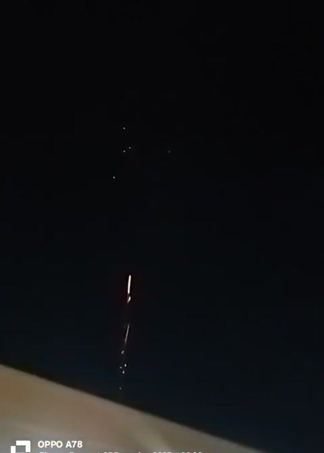 fireworks going off against a black night sky. The fireworks display various colors, including white, yellow, orange, and green. The camera angle is from below, looking up at the sky. A portion of a light-colored structure is visible at the bottom of the frame. The video also includes the text "OPPO A78" and "@barca_flamez 23 December 2025 at 20:02" in the lower left corner. There is music playing in the background.