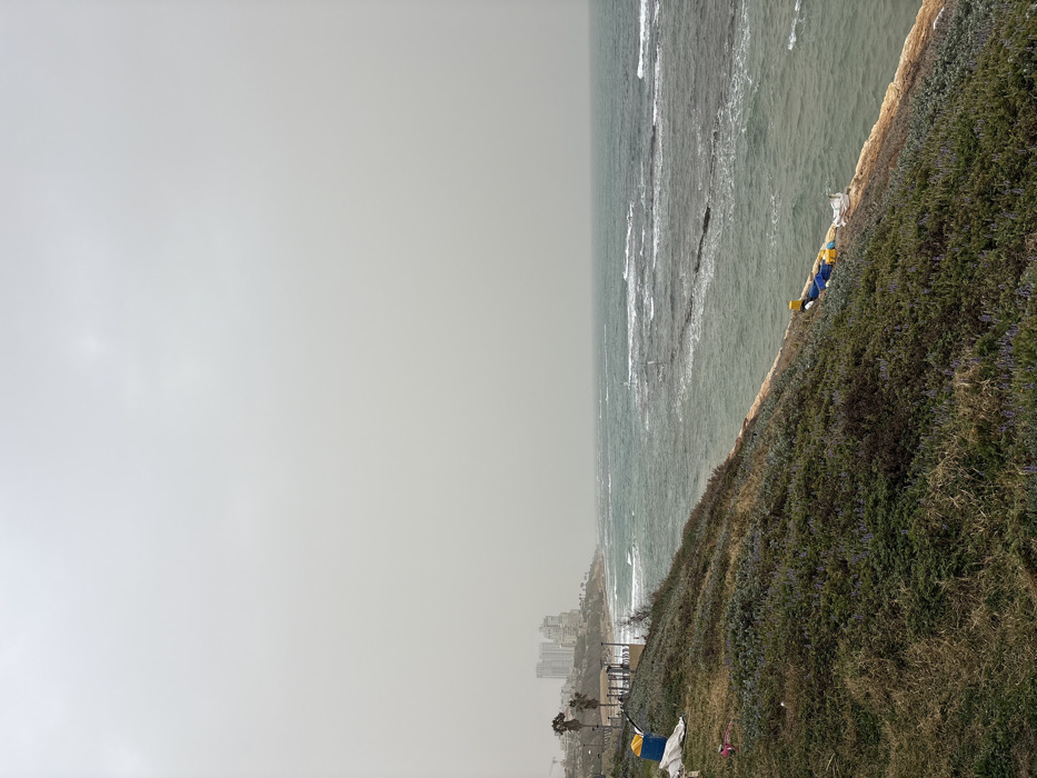 The image displays an overcast coastal scene in Tel Aviv-Yafo, Israel. The sky, a uniform light grey, occupies the upper two-fifths of the frame. The Mediterranean Sea, characterized by choppy, dark turquoise-green water with numerous whitecaps, extends from the mid-ground to the right foreground. Submerged rock formations or artificial structures are visible in the water, contributing to wave patterns. The foreground features a steep, vegetated hillside covered with green shrubs and scattered purple flowering plants. Along the coastline in the mid-ground, a small, light-colored shelter with a roof and supporting columns is visible, flanked by two palm trees. Further down the coast to the left, a dense urban skyline composed of multi-story buildings, including one with a visible construction crane, is partially obscured by distance and atmospheric haze. On the left side of the foreground hillside, a blue tarp covers an unidentifiable object, positioned next to a yellow container. Closer to the water's edge on the right side of the hillside, several yellow and blue objects, possibly buoys or marine equipment, are arranged alongside white wrapped bundles. Multiple vertical poles or markers are present within the nearshore water. No individuals are visible in the scene.