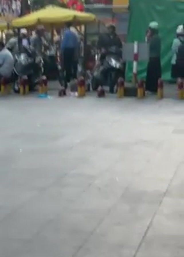 partially obstructed street scene in Vietnam, likely during the day. Several people are visible. One person is standing near a white bench with a black guitar case slung over their shoulder. They are wearing a light blue shirt and a black skirt. Another person in a green helmet is standing nearby. Behind them, a green tarp covers something, likely a stall or building. To the left of the frame, there are several people on motorbikes parked behind short, red and yellow bollards. Behind them, there is a food stall with a yellow awning. The ground is paved with grey tiles arranged in a diagonal pattern. The overall impression is a typical, busy Vietnamese street scene.
