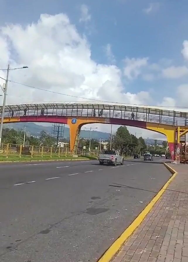 pedestrian bridge over a road on a sunny day. The bridge is painted in yellow, red, and blue. There are people walking across the bridge. Cars are driving on the road underneath the bridge. There is a brick sidewalk with a yellow curb on the side of the road. The sky is blue with white clouds. There are trees and buildings in the background. The number "8" is visible on the side of the bridge.