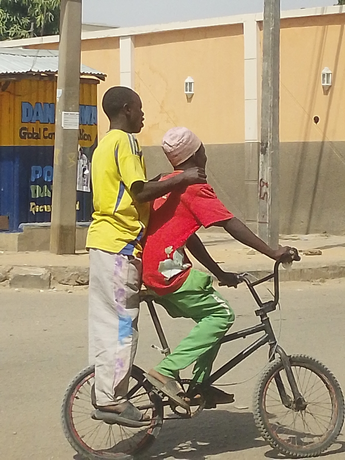 Two individuals are riding a black BMX-style bicycle on a paved street in Babban Giji, Nigeria
