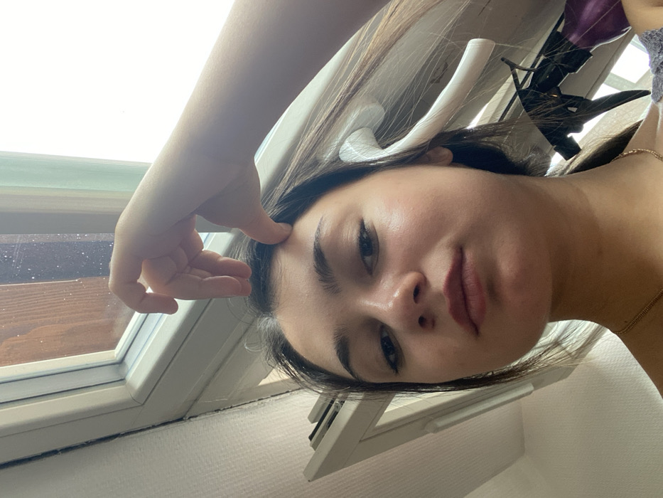 A young female, appearing to be in her late teens or early twenties, is depicted in a close-up, upward-angled shot. She has dark brown hair, fair skin, dark eyes, and full lips, maintaining a neutral expression while looking directly at the camera. Her right hand is raised, with the index finger and thumb lightly touching her forehead near the hairline. She is wearing a light-colored top and a thin, golden-colored chain necklace is visible. The background features a white-framed tilt-and-turn window, partially open, revealing a bright, overcast sky and a brown, textured surface, possibly a roof or siding, outside. A white window handle is visible on the right side of the frame, and a dark-colored spray bottle hangs below it. To the left, a textured white wall is visible. Part of a white blind or shutter mechanism is present in the lower-left background. The scene is illuminated by natural light entering through the window. This indoor scene is located in Bouxwiller, France.