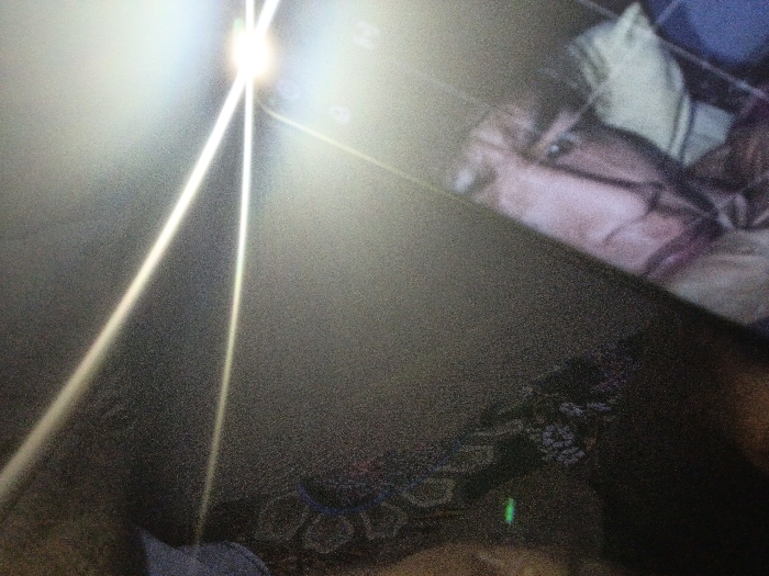 close-up of a tablet screen displaying a blurry video or photo. In the visible part of the screen, a person appears to be lying down, possibly asleep, with a pillow nearby. The tablet's surface is dark with visible glare from a light source. A pattern is partially visible underneath the tablet, suggesting a bedspread or rug.