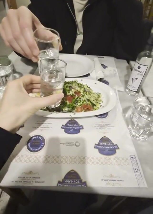two people toasting with clear alcoholic beverages, possibly ouzo or raki, over a table with Greek salad, a bottle of liquor (labeled "Tsipouro"), and glasses of water. The table has a paper placemat with the restaurant's name "TOY ФANH" printed repeatedly. One person is wearing a black zip-up jacket, and the other is wearing a dark garment. The glasses are clear, and the salad is a mix of chopped vegetables. The table setting is simple, with a small white plate and a spoon next to the salad. The setting seems to be a restaurant interior.