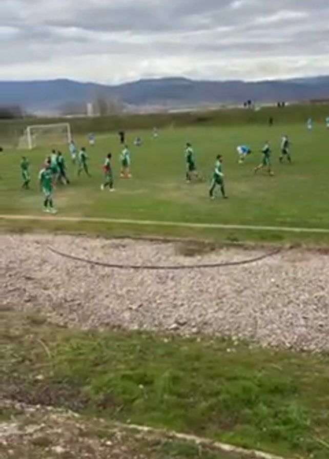 soccer game from the perspective of a spectator seated above the field. Players in green and white uniforms are actively playing, while players in light blue appear to be defending. The playing field is green grass, surrounded by a rocky area and a few spectators sitting on a makeshift wooden bench. In the background, there are mountains beneath an overcast sky. A red-clad individual standing on the field appears to set off a green smoke flare, and the camera pans to capture more of the audience. The viewers are bundled in various jackets and hats.