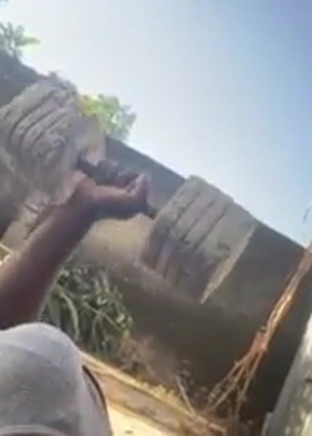 A person is lying on their back in an outdoor setting and performing a dumbbell press. The dumbbell is made of concrete and has three segmented weights on each side. The person is wearing a gray shirt and gray shorts. Behind the person is a concrete wall and a corrugated metal structure. There is also a tall, thin plant with leaves blowing in the wind. The sky is visible and is light blue. The sun appears to be overhead.
