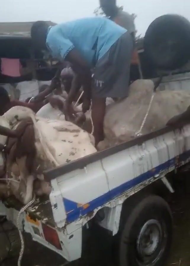 three men loading large, heavy bags into the back of a small, white pickup truck. The truck's bed is already partially filled with similar bags. The men are dressed casually. One is wearing a light blue shirt and dark shorts, another is wearing an orange shirt, and the third is wearing a red shirt. The truck appears to be in a somewhat dilapidated condition, with some damage visible on the side. The environment appears to be an outdoor setting, possibly a yard or field, with other people and structures visible in the background. The bags seem to be quite heavy, and the men are exerting effort to lift and position them.