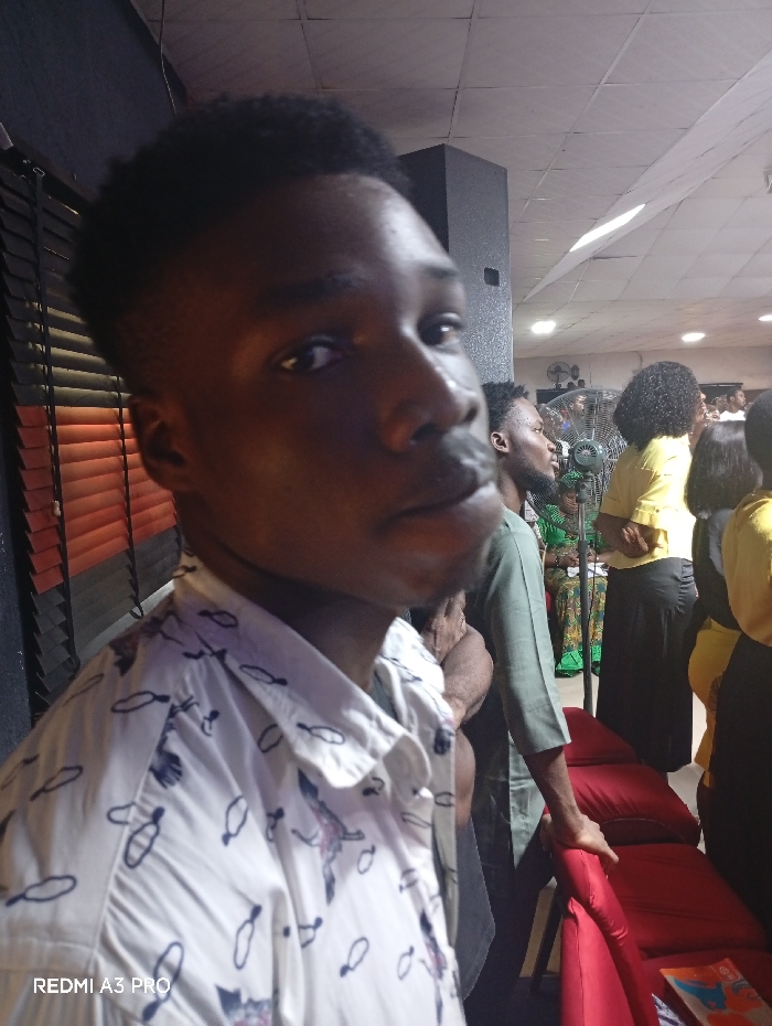 The scene is located indoors within the city of Onitsha, Nigeria. In the foreground, a young Black male, oriented slightly right of center, looks directly at the camera. He possesses short, dark, faded hair and wears a white collared shirt patterned with dark, abstract shapes. A "REDMI A3 PRO" watermark is visible in the bottom left corner. To the right and slightly behind the foreground subject, a second Black male is partially visible in profile, facing right. He wears a light green long-sleeved top and his right hand is resting on the back of a red upholstered chair. Further into the background, several individuals are partially visible, many wearing yellow tops and dark bottoms, suggesting a coordinated attire. A large, industrial-style standing fan is situated in the background. The left background features a dark wall with horizontal slat blinds. The ceiling is a light-colored grid, consistent with acoustic tiles, and the overall environment suggests an assembly or event space.