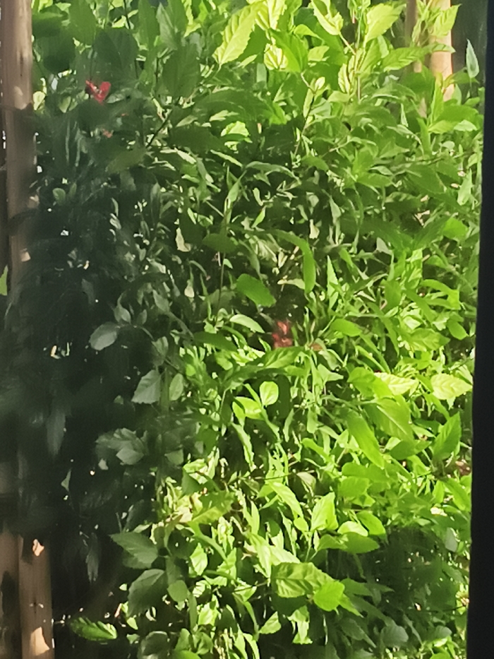 This image displays a dense mass of green foliage with interspersed reddish-pink blossoms, located in Chimbote, Peru. The vegetation, likely a bush or hedge, fills the frame. The leaves exhibit varying shades of green; the right and upper-right portions appear brighter and more vibrant due to direct sunlight, while the left side is significantly darker and shadowed. Several small, red or reddish-pink flowers are visible throughout the greenery, with a notable blossom prominent in the upper-left quadrant. Along the far left edge, a vertical, light brown wooden structure, possibly a fence post or bamboo stake, is partially visible and mostly in shadow. The right edge of the image is defined by a dark, vertical, undefined border. No individuals, animals, or specific actions are identifiable within the scene.